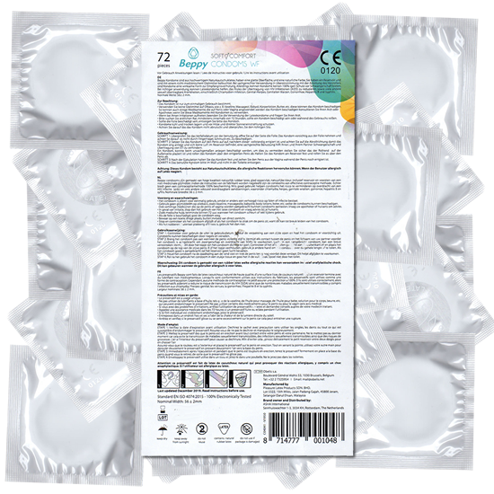 Unsere Beppy Comfort Kondome gehören zur Kategorie Kondome aus Naturkautschuklatex und werden zur Empfängnisverhütung verwendet. Die feuchte Silikonöl-Beschichtung unterstützt eine gleitfähige Anwendung. Die Größe eines Kondoms wird über die nominale Breite angegeben und nicht über die Länge des Penis.