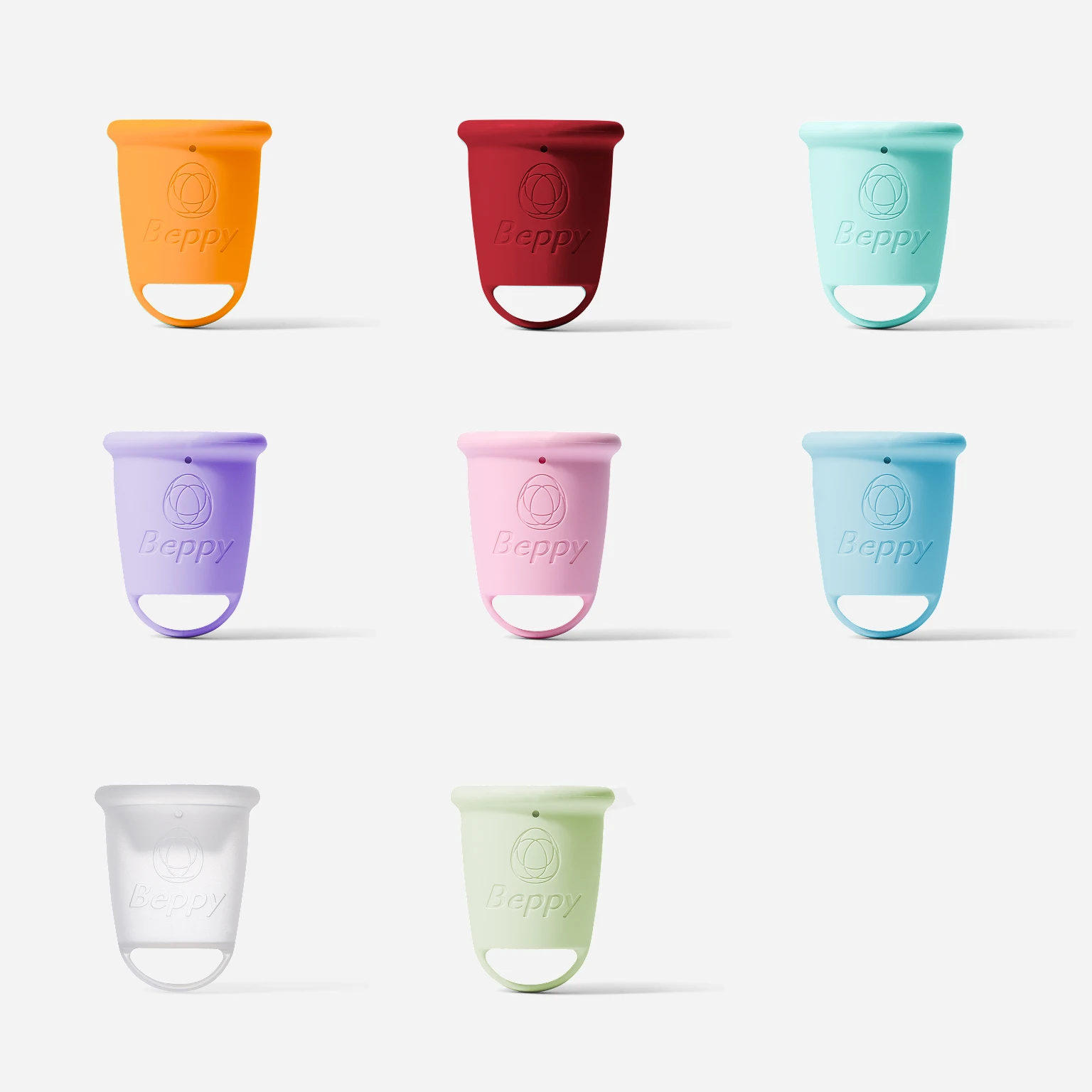 Beppy Cup Menstruationstasse: die beste und innovativste Menstruationstasse! Wiederverwendbare Menstruationstasse aus hautfreundlichem Silikon mit weicher Schlaufe und Beutel in Lila, Orange, Pink, Transparent oder Türkis.
