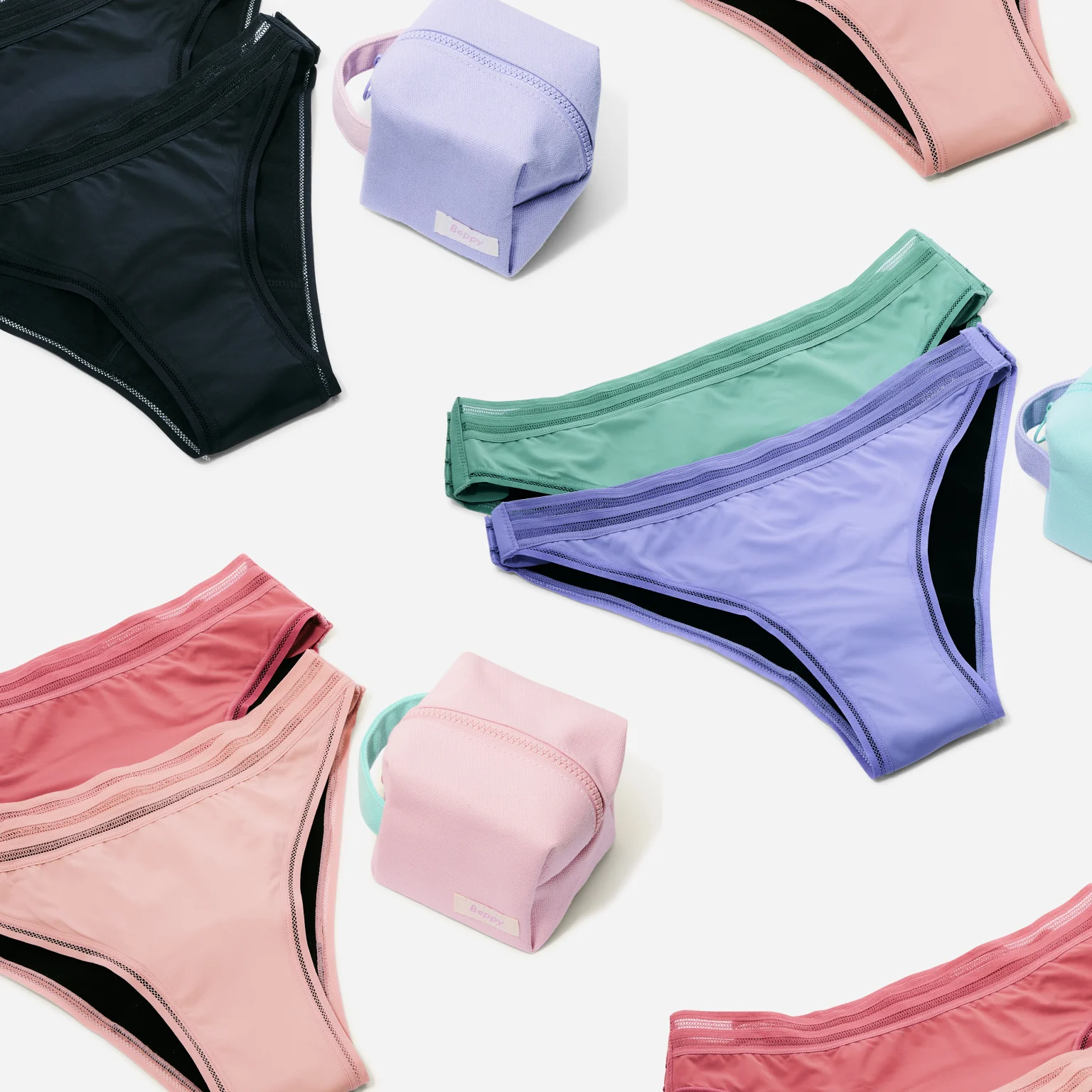 Unsere Beppy Panties (2 Stück) sind verstellbare, waschbare Menstruationsslips mit Bloat & Swap System, zwei unterschiedlichen Slip-Logiken pro Set und Varianten in Siren, Onyx oder Coral sowie XS bis XL.